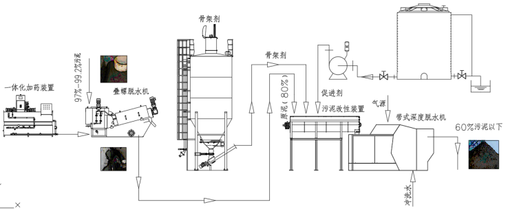 1、经过叠螺式污泥脱水机初级脱水,将含水率99%的污泥降至含水率75%-85%。