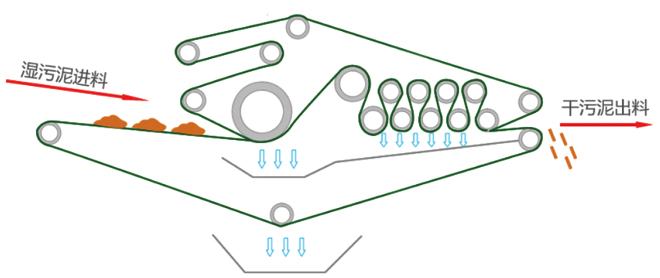 工作原理:通过对含水率80%左右的污泥进行化学调质改性处理后再高压挤压脱水至含水率60%以下,KTSD压滤脱水机是由上下两条张紧的滤带夹带着污泥层,从一连串有规律排列的辊压筒中呈S型经过依靠滤带本身的张力形成对污泥的挤压和剪切力,把污泥层中的毛细水挤压出来,获得含固率较高的泥饼,从而实现污泥的脱水。