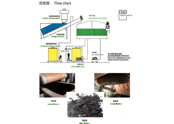 设备特点:可以直接与原始污泥出口对接,不另行配置,直接连接,从进料到出泥饼几分钟完成,从而达到不间断连接生产的目的不需要预留中间堆放场地,大大减少了污泥处理处置过程的投资、运营成本和环境危害。
